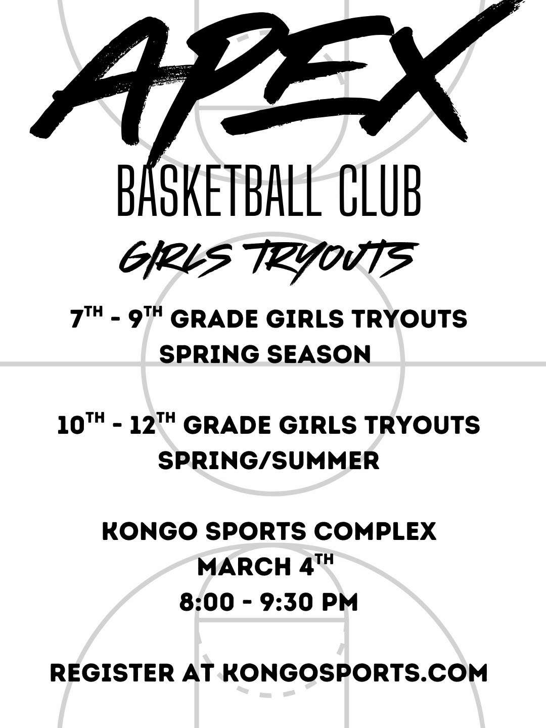 Apex Basketball Club is the official club basketball team of Kongo Sports Complex. It has girls & boys competitive programs have multiple teams per age group. The competitive boys program offers teams for 2nd grade through high school. The competitive girls program starts at 4th grade and goes through high school. Our 2nd - 9th graders can go year round or choose between Fall/Winter and/or Spring. Competitive high school age athletes compete in the spring and summer with tryouts in February/March. There are multiple teams per grade split into commitment and skill levels.